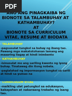 Mga tanong sa Tagalog Filipino Language and Culture Non-English Names Pronunciation Religion. BIONOTE SA TALAMBUHAY AT KATHAMBUHAY. Ito ay isang anyo ng panitikan na naglalahad ng kasaysayan ng buhay ng isang tao.